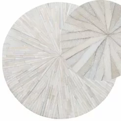 Pyöreä matto pehmeää nahkaa. Matto koostuu useista luonnonvaaleista nahkatilkuista. Maanläheiset sävyt tuovat lämpöä ja viihtyisyyttä tilaan. Kääntöpuolella pehmeä lattiaa naarmuttamaton huopapinta. Koska jokainen matto on käsintehty, väreissä ja kuvioissa saattaa esiintyä pieniä vaihteluita.