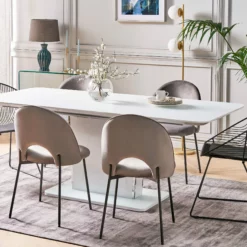 Varusta ruokailutilasi tällä jatkettavalla ruokapöydällä järjestääksesi illallisjuhlia ystäviesi kanssa tai tarjotaksesi vieraileville sukulaisillesi tarpeeksi ruokailutilaa. Kätketyn perhosmekanismilla jatkettavan ominaisuutensa ansiosta voit lisätä lisää istumatilaa helposti ja nopeasti jopa kuudelle hengelle. Koko pöytä on valmistettu MDF-levystä ja pöytälevy on viimeistelty karkaistu lasitasolla. Paksun jalustansa ansiosta pöytä on erittäin vakaa.