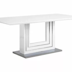 Erittäin kiiltävä, kauniisti geometrinen ruokapöytä kohottaa mitä tahansa ruokailutilaa. Sen jalustan teräksiset yksityiskohdat luovat katseita keräävän kalusteen, jonka pöytälevyn alle mahtuu helposti jopa kuusi tuolia. Valkoisen ja hopean yhdistelmä näyttää hyvältä useissa värimaailmoissa, tuoden sisustukseen ripauksen klassista eleganssia.
