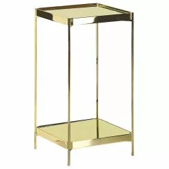 Tuo olohuoneeseesi ripaus glamour-tyyliä tällä tyylikkäällä, kiiltävällä sivupöydällä. Sen peilaava pöytälevy on valmistettu kestävästä karkaistusta lasista ja kullanväriset jalat metallista. Alaosassa sijaitseva hylly tarjoaa tilaa kirjoille, lehdille ja muille tarpeellisille esineille tai koristeille. Sivupöytä sopii täydellisesti sohvan tai nojatuolin viereen. Materiaaliensa ja muotojensa ansiosta se näyttää erityisen hyvältä missä tahansa modernissa sisustuksessa.