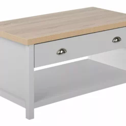 Tämä minimalistisesti muotoiltu, klassisen muodon omaava sohvapöytä sopii saumattomasti perinteisiin, nykyaikaisiin tai rustiikkisiin sisustuksiin. Leveiden ja tilavien laatikoidensa sekä alahyllynsä ansiosta sohvapöytä tarjoaa paljon säilytystilaa erilaisille tarpeellisille esineille ja lehdille. Suuri, vaalean puun sävyinen pöytälevy tarjoaa paljon tilaa juomien ja naposteltavien tarjoiluun. Neutraalien väriensä ansiosta sohva on helppo sovittaa useisiin eri värimaailmoihin.