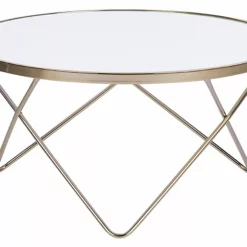 Tällä sohvapöydällä tuot olohuoneeseesi art deco -tyyliä ja vuosisadan puolivälin hohtoa. Pyöreän pöydän kullanväriset metallipinnijalat ja valkoinen karkaistu lasitaso antavat muotoilulle ylellisen ja rikkaan ilmeen. Tämä ajaton sohvapöytä täydentää mitä tahansa modernia, glamour- tai retrotyylistä sisustusta kiiltävän viimeistelynsä ansiosta.