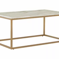 Tämä moderni sohvapöytä on saanut inspiraationsa ylellisestä vuosisadan puolivälin muotoilusta. Sohvapöydän avoin runko on valmistettu kultaiseksi jauhemaalatusta metallista. Pöytälevy on valmistettu MDF-levystä, joka on viimeistelty beigellä marmorikuviolla. Leveä pöytälevy ja ainutlaatuinen muotoilu luovat tyylikkään ja käytännöllisen kokonaisuuden, joka antaa olohuoneen sisustukselle ylellisen ilmeen.
