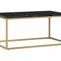Tämä moderni sohvapöytä on saanut inspiraationsa ylellisestä vuosisadan puolivälin muotoilusta. Sohvapöydän avoin runko on valmistettu kultaiseksi jauhemaalatusta metallista. Pöytälevy on valmistettu MDF-levystä, joka on viimeistelty mustalla marmorikuviolla. Leveä pöytälevy ja ainutlaatuinen muotoilu luovat tyylikkään ja käytännöllisen kokonaisuuden, joka antaa olohuoneen sisustukselle ylellisen ilmeen.