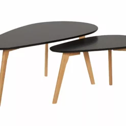 Tämä monikäyttöinen, kahdesta sohvapöydästä koostuva setti on täydellinen lisä sekä skandinaavisiin että moderneihin sisustuksiin. Tyylikkäästi kaartuvat pöytälevyt on valmistettu MDF-levystä, joka on päällystetty mustan värisellä laminoinnilla. Vaaleat pyökkijalat korostavat pöytälevyjen väriä kauniisti, taaten vakauden. Voit asettaa sohvapöydät erilleen tai allekkain tilan säästämiseksi.
