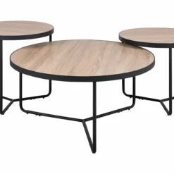 Tuo olohuoneeseesi luonnetta ja urbaania tunnelmaa näillä industriaalisen tyylin inspiroimilla sohvapöydillä. Niiden pyöreät, vaalean puun sävyiset pöytälevyt sopivat täydellisesti kynttilöiden, kasvien ja valokuvien esille panoon tai naposteltavien tarjoiluun. Mustaksi jauhemaalatut metallirungot takaavat vakauden tyylistä tinkimättä. Voit asettaa sohvapöydät yhteen upean kokonaisuuden luomiseksi, tai käyttää niitä erillään. Muotoilu ja neutraalit värit mahdollistavat pöydän sijoittamisen useisiin erilaisiin sisustuksiin, moderneista skandinaavisiin.