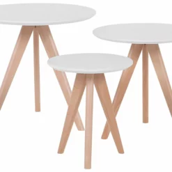 Moderni kolmen sohvapöydän setti on täydellinen korostuskappale mihin tahansa nykyaikaiseen olohuoneeseen. Kolmijalkaiset rungot korostavat valkoisia pöytälevyjä kauniisti. Kestävästä MDF-levystä valmistetut valkoiset pöytälevyt ja vaaleat pyökkijalat takaavat pitkäikäisyyden. Sohvapöytäsetti tarjoaa paljon tilaa erilaisille koristeille, lehdille sekä tarpeellisille esineille. Keveytensä ansiosta voit siirrellä settiä ja asetella pöydät miten haluat. Aseta pöydät sohvan tai nojatuolin läheisyyteen luodaksesi tyylikkään kokonaisuuden.